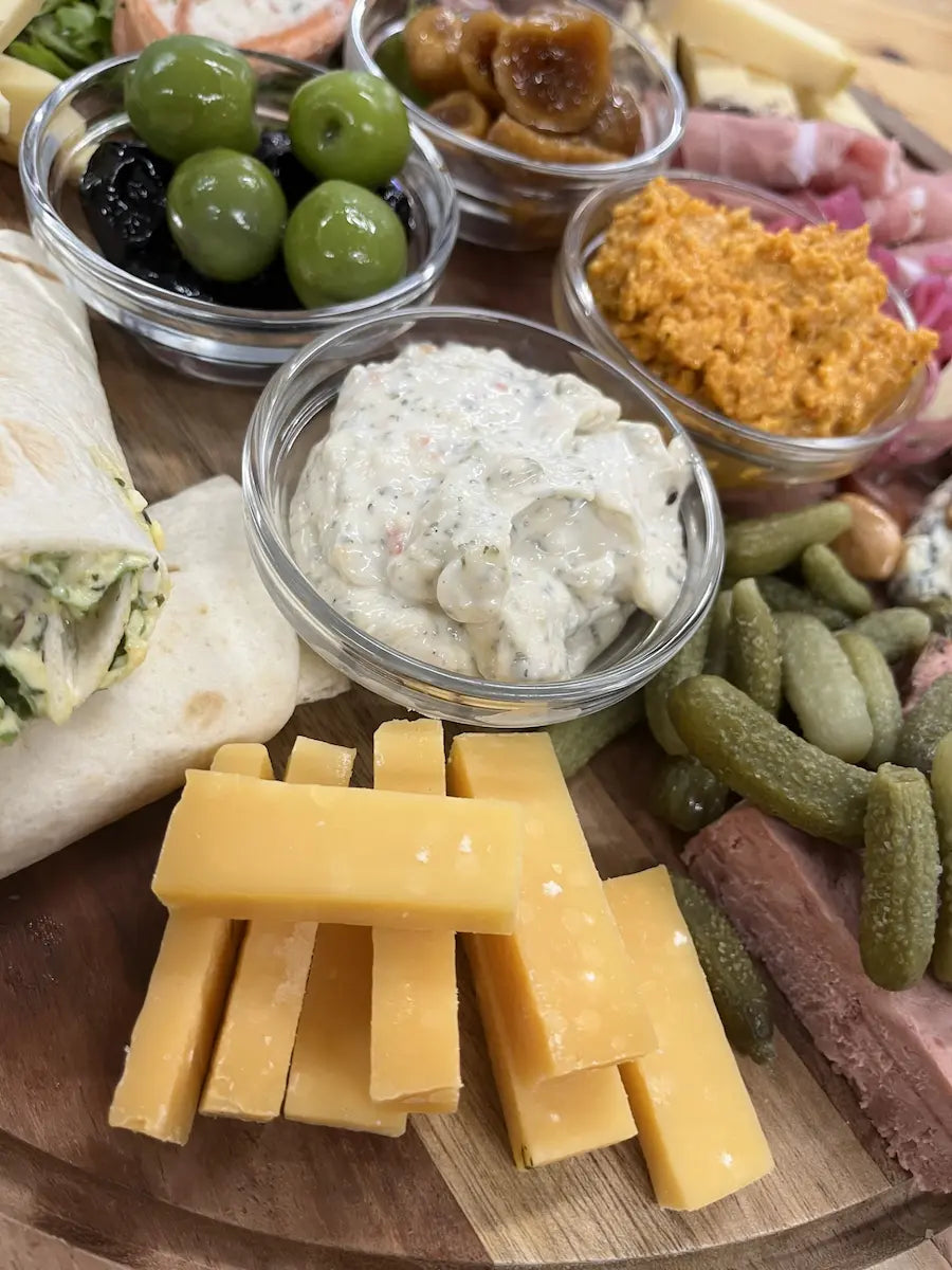 5 X TILBEHØR: Hjemmelavet pesto, mix af oliven, hjemmelavet aioli samt marinerede figner