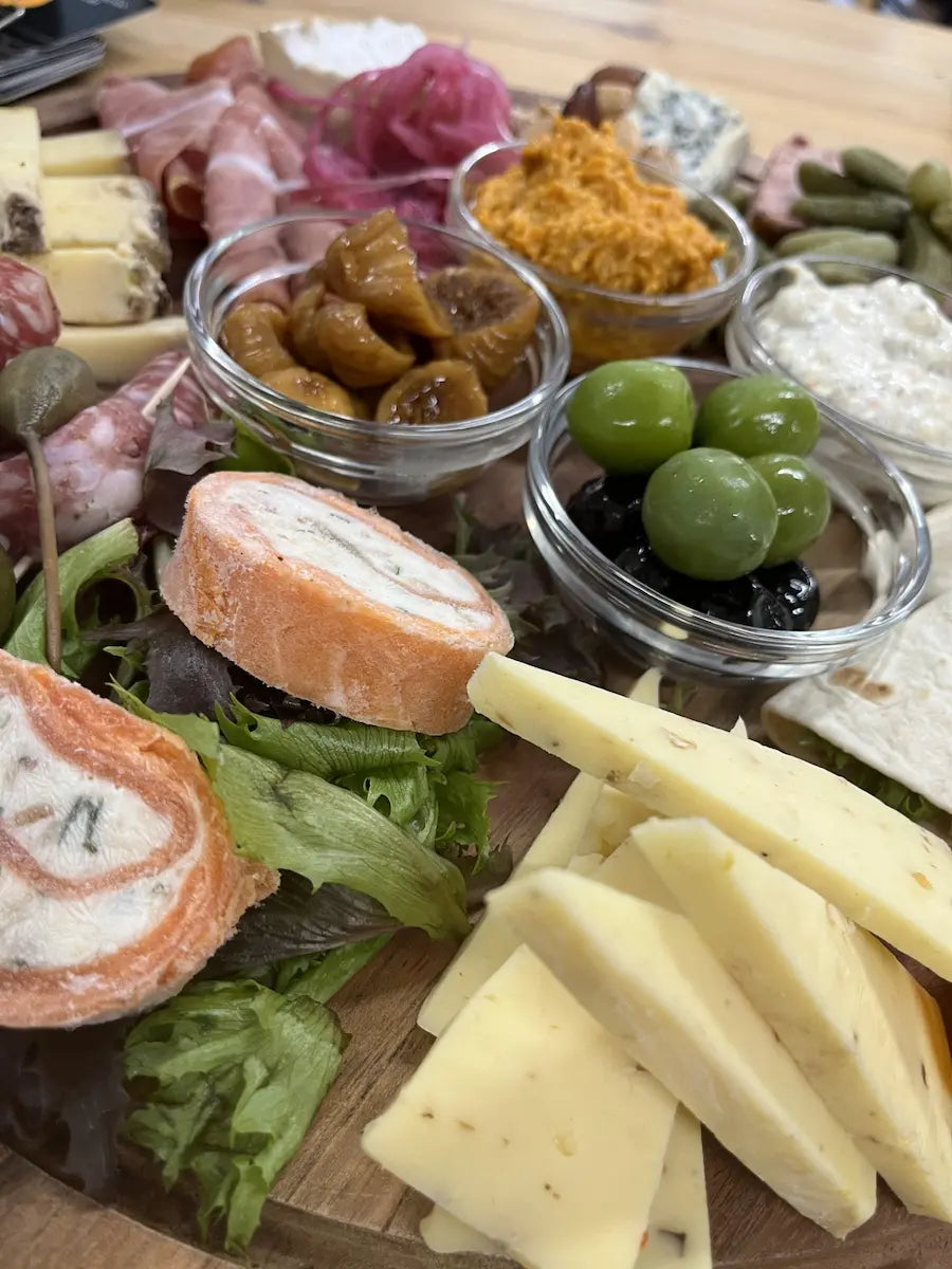 5 X FISK & CHARCUTERIE: Serranoskinke i skiver, salami i skiver, wraps med hjemmelavet æggesalat, lakseroulade og paté med cornichoner
